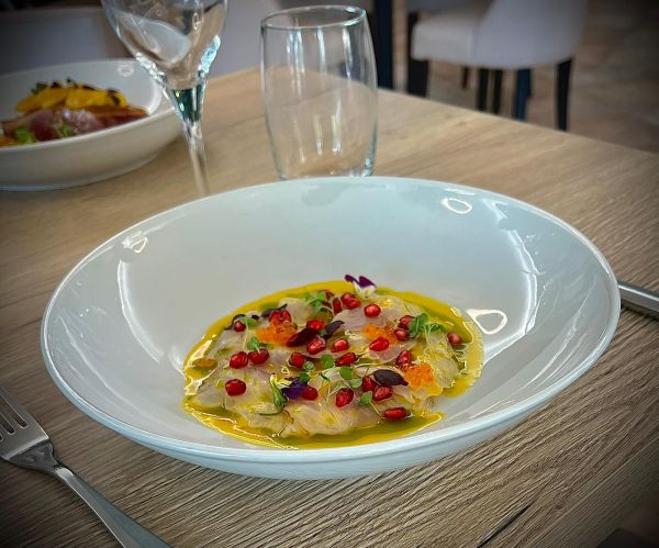 Ceviche de bar, vinaigrette passion et éclats de grenade